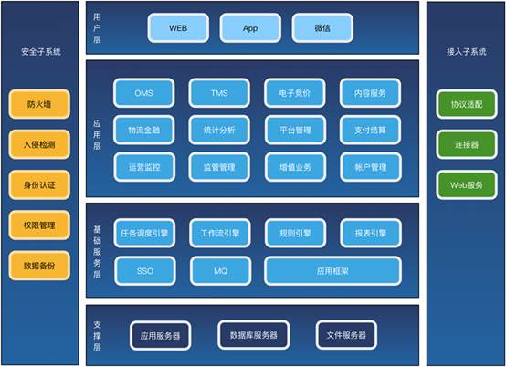 世德物流信息平台于2015年9月开始运营,平台围绕“大宗商品运输”进行产品研发,利用传统互联网技术及移动互联网技术打通大宗货物运输的各节点数据,优化业务流程,共享数据信息,以用户为中心,解决行业问题,如:共享货源信息,快速的组织运力,承运人获取最新货源信息,过磅称重数据同步交互,车辆行驶位置全程定位,在线支付结算运费等,降低平台用户物流管理成本,提高货物运输效率,扩展货物来源渠道,提高车辆使用效率,增加承运人收入。下图为平台系统架构。