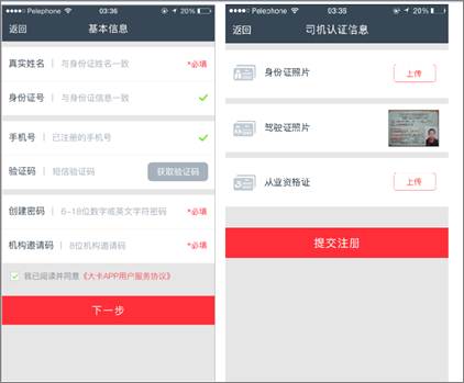 司机注册时,除基本信息录入外,还须上传身份证、驾驶证、从业资格证的照片,如下图: