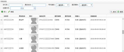 按手机号,司机名称及创建时间可以查询司机信息,如下图: