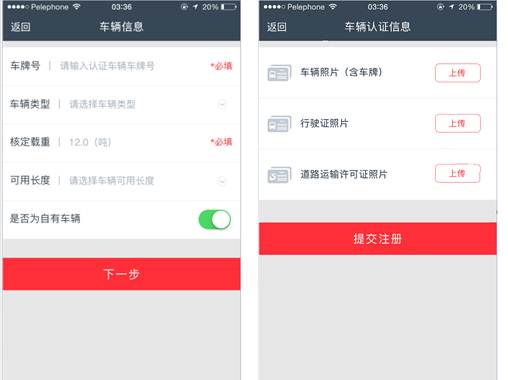 车辆注册功能:除基本信息录入,须上传车辆、车辆行驶证、道路运输许可证的照片,如下图: