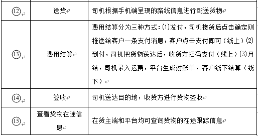 3.推进货运过程标准化建设。首先实现信息传递的标准化,利用互联网技术和大数据对平台信息数据实行采集、分类、有序归类,实现平台快速在线配货和集成,利用标准化提升匹配效率;其次推进装车卸车环节的规范化,节约装卸时间,可通过规范货物车型、车重、车长等基本运力标准化来实现;再其次是实现运输价格的标准化,根据各地区不同时段,通过预测去程返程配货概率,制定依据实时供求关系的价格形成机制、价格明细公开制;最后是实现知道付款方式和结款方式的标准化和智能化,采用智能化的交易模式,用户只要注册平台便可享受便利的支付和结款,同时利用信息技术对交易过程全程监督,实现透明化。