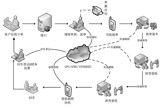 已接单货源:系统设置语音提示和短信提醒,货主可查看司机已抢单或客服已分配的货源信息和接单的车辆信息,运输过程全程跟踪,货主可进行查询货物的在途信息。
