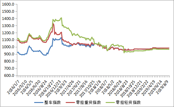 分车型看,各车型指数波动幅度较小但均有不同程度回落,零担指数回落幅度高于整车指数。其中,整车指数为983.71点,比上周回落0.05%;零担重货指数为983.24点,比上周回落0.07%;零担轻货指数为965.08点,比上周回落0.13%。