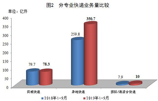 1-9月,同城、异地、国际/港澳台快递业务量分别占全部快递业务量的17.8%、79.9%和2.3%;业务收入分别占全部快递收入的10.3%、53%和9.9%。与去年同期相比,同城快递业务量的比重下降5.1个百分点,异地快递业务量的比重上升5.1个百分点,国际/港澳台业务量的比重基本持平。