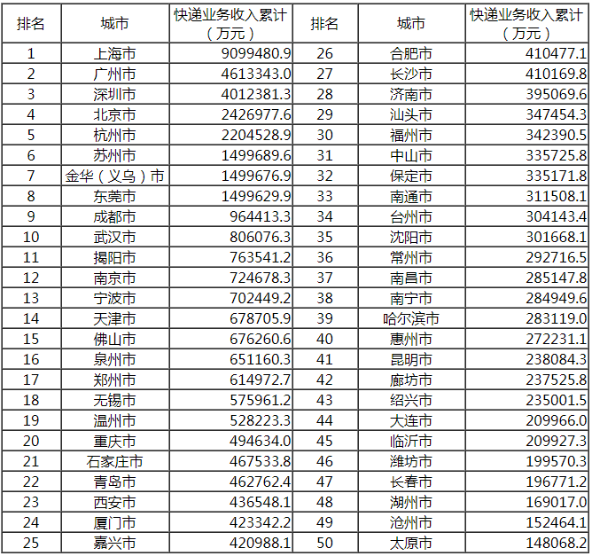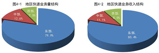 1-9月,东、中、西部地区快递业务量比重分别为79.9%、12.6%和7.5%,业务收入比重分别为80.4%、11.1%和8.5%。与去年同期相比,东部地区快递业务量比重下降0.1个百分点,快递业务收入比重上升0.4个百分点;中部地区快递业务量比重上升0.5个百分点,快递业务收入比重下降0.1个百分点;西部地区快递业务量比重下降0.4个百分点,快递业务收入比重下降0.3个百分点。