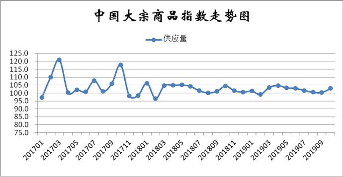 2019年10月份,大宗商品供应指数止跌反弹至102.9%,指数为近四个月以来的高点,较上月回升2.6个百分点,显示随着国庆假期的结束以及限产季的临近,部分行业生产企业抓紧时间开工,国内大宗商品市场供应量明显增加,供应压力开始加大。各主要商品中,除钢铁供应量继续减少外,其余品种均呈现明显上升的态势。