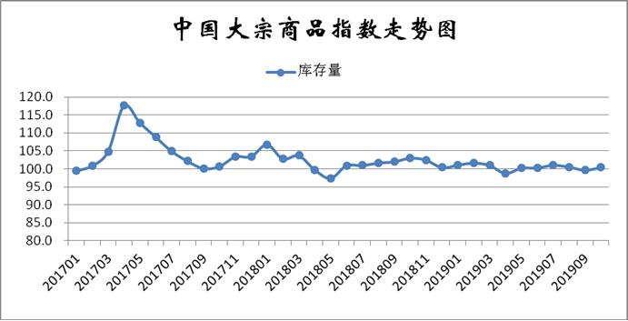 2019年10月份,大宗商品库存指数止跌反弹至100.4%,显示商品库存开始增加,库存压力有所加大。各主要商品中,钢铁、成品油和有色金属库存量继续减少,铁矿石、原煤、化工和汽车库存量均有所增加,且增速均有所加快。
