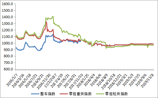 分车型看,各车型指数环比均有所回升。其中,整车指数为987.86点,比上周回升0.28%;零担重货指数为987.10点,比上周回升0.31%;零担轻货指数为968.68点,比上周回升0.31%。