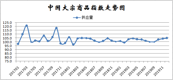 2019年12月份,大宗商品供应指数继续回升0.7个百分点至104.9%,创下近两年来新高,显示国内大宗商品市场供应量持续增加,供应压力进一步加大。从各主要商品来看,除成品油外,其余品种均呈现增加态势,从生产企业的情况来看,由于环保限产政策较为宽松,加上节前存在补库需求,产品生产相对稳定,导致商品供应量持续增加。
