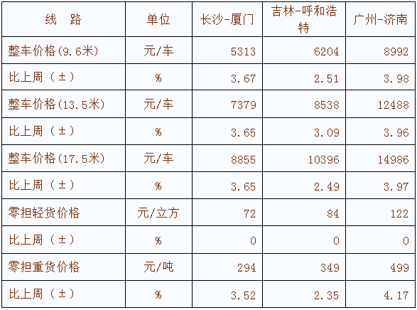 分车型看,各车型指数均有所回升。其中,整车指数为986.08点,比上周回升0.06%;零担重货指数为985.20点,比上周回升0.07%;零担轻货指数为968.21点,比上周回升0.01%。