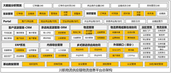 其中黄色部分为本期系统实施范围,其它部分将会结合川航物流后续发展情况逐步开展。功能中涉及到基础数据管理、财务结算管理、运输物流管理、客户承运商管理、接口管理、企业门户、报表中心等多个模块。