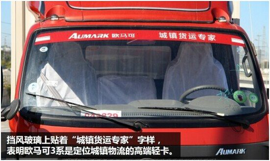 欧马可的挡风玻璃上贴着“城镇货运专家”字样,表明欧马可是定位城镇货运的轻卡。随着我国城市化进程的加快,很多城市都已出台对黄牌车辆实施限行的措施,欧马可相对较高的运输能力已经开始在城镇货运市场展露头角。