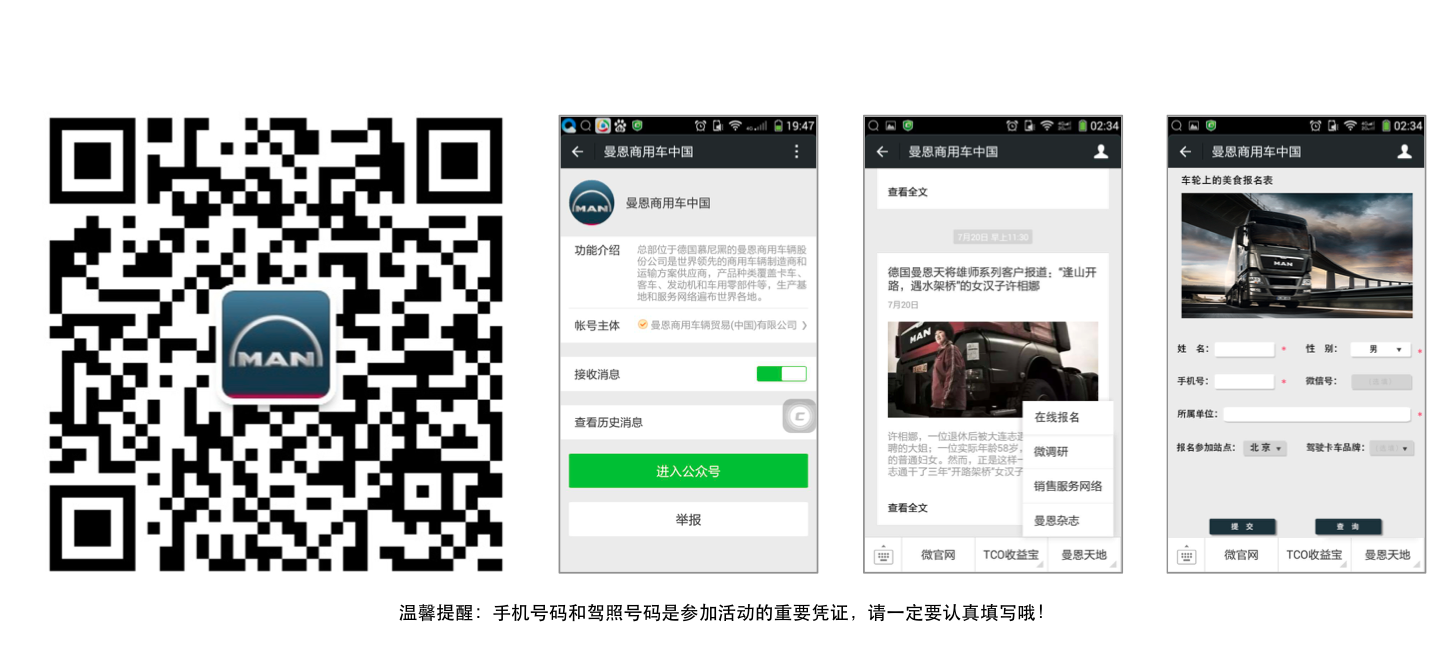 那么,到底怎么才能成为一名“MAN粉儿”呢?请关注曼恩商用车中国微信,并按如下方式进行报名。