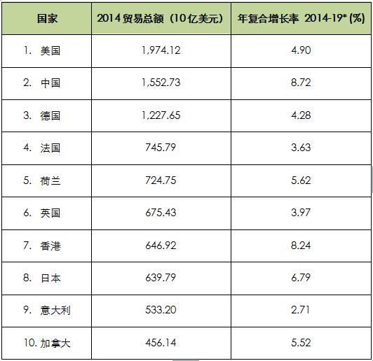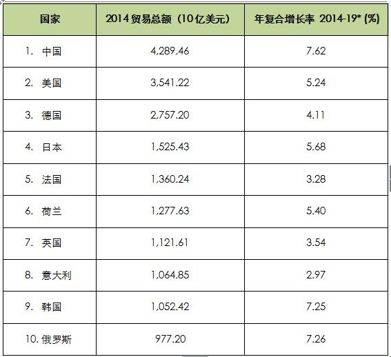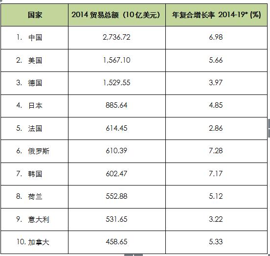 报告指出,中国已成为全球最大贸易国(表一)和最大出口国(表二),同时也是全球第二大进口国(表三)。虽然中国经贸持续增长引发了国际社会的担忧,但《晴雨表》显示,未来五年中国的年增长率预计为6.98%——而在上次报告中同期数字为5.60%,中国的主导地位将依旧坚挺。Mandhir Singh对此发表了中肯的看法:“中国在世界贸易当中的领先地位在未来几年都不会动摇。但是市场对中国能否保持现在的增长速度存有担忧。而且中国的现有政策是从出口为导向的经济转为扩大内需,不断提升民众的生活质量,因此其影响力还有待观察。”