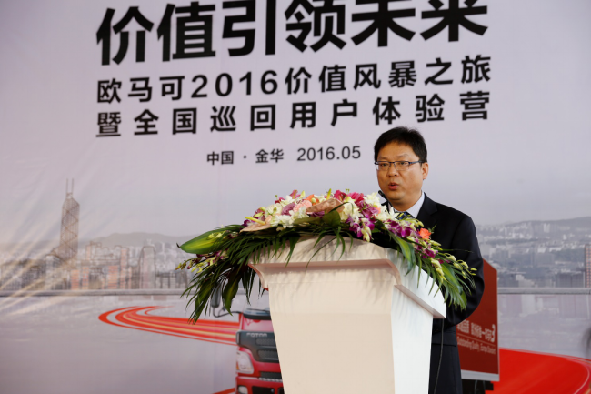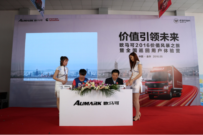 【欧马可营销公司服务总监彭仕顺先生和北京福田康明斯发动机有限公司南方大区经理黄信宽先生共同完成欧马可2016价值风暴之旅暨全国巡回用户体验营金华站启动仪式】