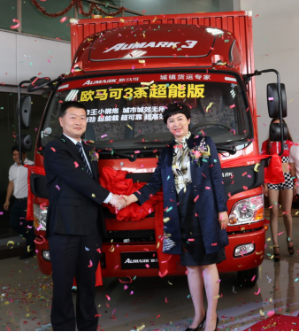 【福田汽车集团欧马可业务总监、欧马可事业本部本部长顾德华先生与北京福田康明斯发动机有限公司党委副书记尤静女士共同为欧马可3系超能版新车揭幕】