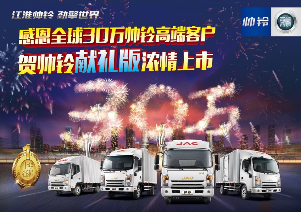 从2004年帅铃第一辆轻卡投放国内市场,到2016年上半年帅铃全球销量突破30万台,帅铃的品质越来越被市场与用户认可。7月16日,为答谢全球用户对帅铃品牌的厚爱,江淮轻型商用车将特别推出帅铃献礼版车型,近期将在江淮官网与卡车之家双平台上市。
