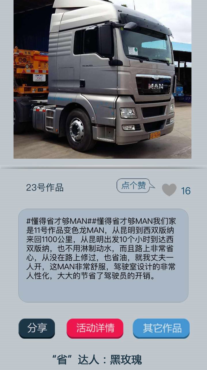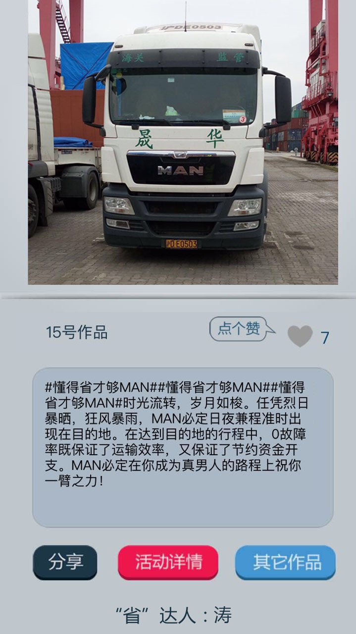 在德国MAN的辞典中,“省时”、“省钱”、“省心”、“省油”“省力”是非常重要的五个关键词。而对于专业物流从业者来说,“省钱”无疑是最具有现实意义的那一个,众多“省”达人也秀出了自己的与德国MAN的“省钱”故事。15号“省”达人“涛”在自己的作品中提到:“德国MAN卡车的0故障率既保证了运输效率,又保证了节约资金开支。”
