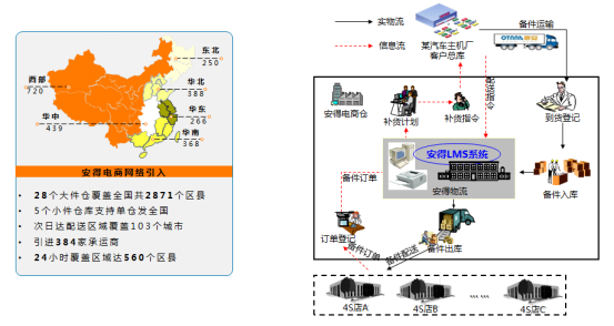 ▲ 安得物流与某汽车主机厂备件合作案例。通过引入安得电商物流网络,将客户备件输送至吉利全国门店,并将退件回收。
