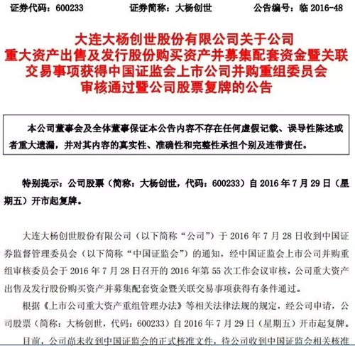 (2016年7月)7月28日,证监会并购重组委员会有条件通过了大杨创世重大资产重组相关事项。这意味着,圆通成功借壳大杨创世,成为中国第一个登陆A股的快递企业。圆通董事长喻渭蛟表示,圆通速递率先通过监管部门审核,既是国家对快递业飞速发展的认可,也是资本市场对快递业前景的看好,圆通将不忘初心,全力打造全球领先的综合物流运营商和供应链集成商。