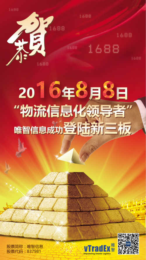 据全国中小企业股份转让系统消息,唯智信息技术(上海)股份有限公司经过证监会的审批,将于今日(2016年8月8日)正式在新三板挂牌,股票代码837981。