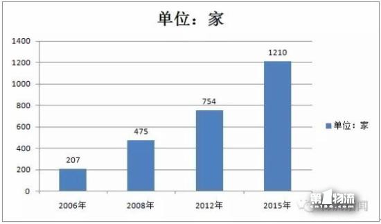 经核实,截至本次调查结束,全国包括运营、在建和规划的各类物流园区共计1210家,比2006年的207家增长484%;与2008年的475家相比,增长155%;与2012年的754家相比,增长60%。如下图所示: