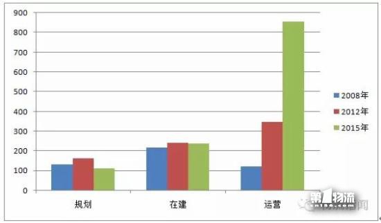 与前两次全国物流园区调查数据相比,本次处于运营状态的物流园区数量大幅上升,由2012年的348家上升至2015年的857家。处于在建状态的物流园区的数量与2012年基本持平。如下图所示: