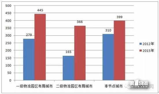 根据《全国物流园区发展规划(2013—2020年)》,我们对所确定的物流园区布局节点城市进行分析。本次调查显示,近三年来国家规划的节点城市物流园区数量增长较快,其中一级物流园区节点城市的园区数量由2012年的279家增长到2015年的445家;二级物流园区节点城市的园区数量从2012年的165家增长到2015年的366家。