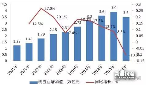 2014年,我国物流业增加值3.5万亿元,可比增长9.5%,保持较快增长,其中,交通运输业增加值2.4万亿元,可比增长8.3%,贸易物流业增加值6781亿元,可比增长7.9%,仓储业和邮政物流业增加值分别增长4.8%和35.6%。