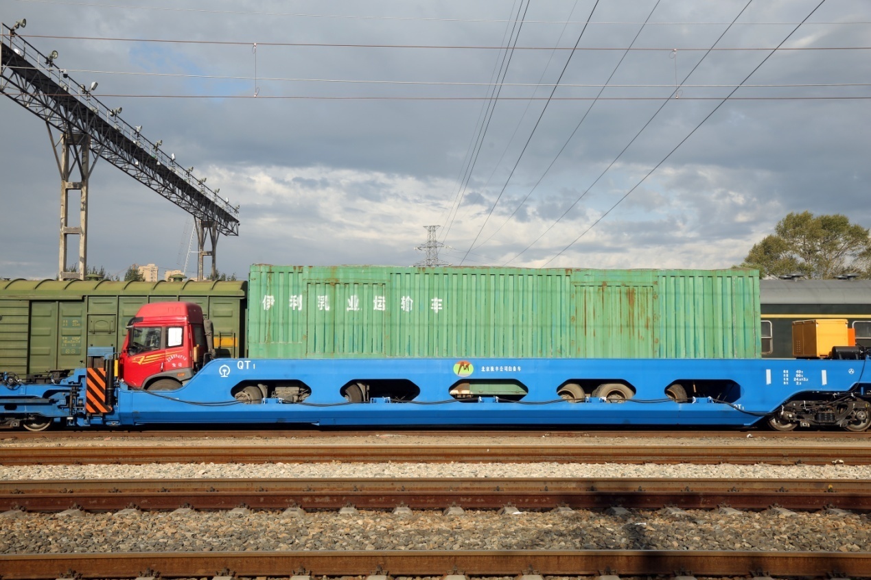 我国第一代多式联运公铁驮背运输专用车是由北京驮丰高新科技股份有限公司历时五年在国内外开展调研、论证的基础上与中车齐齐哈尔车辆有限公司强强联手共同研制的我国新型公铁联运装备。QT1型驮背运输车用于公路汽车整车或半挂车运输,QT2型驮背运输车专用于公路半挂车甩挂运输。这两种车型能够充分利用我国铁路站场设施,满足公路货车整车、半挂车自行上下驮背车的要求,满足由铁路完成中长距离运输及“门到门”服务的运输市场需求。以降低我国陆路货运能耗,降低社会物流成本,减少污染,改善公路拥堵,促进公路运输业秩序化,是现代运输业高效、安全、快捷、节能环保、绿色低碳、大运量、全天候的最佳交通运输方式之一,具有广阔的发展前景和显著的社会效益和经济效益。