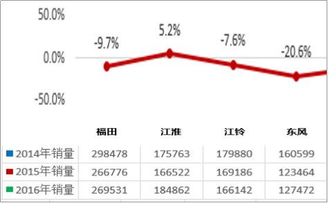 (2014-2016几大主流轻卡车企销量增长率统计,数据来源:中汽协)