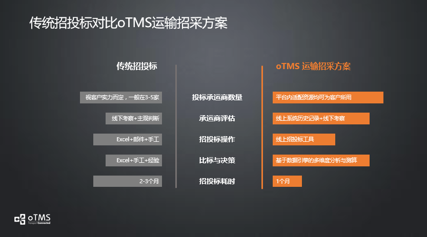 传统的整个招标过程冗长、复杂,3个月尚不能达到特别明显的效果,但海蒂诗在引进oTMS后,线上招标、比价、测算让整个招标在2个月就顺利完成。透明的招标过程帮助海蒂诗基于真实数据考量供应商的价格水平和执行能力,对多种资源进行整合,高效的协助货主和承运商之间进行直线需求匹配。系统的报价功能实现了招投标过程中集成化、透明化的在线报价,降低测算难度。
