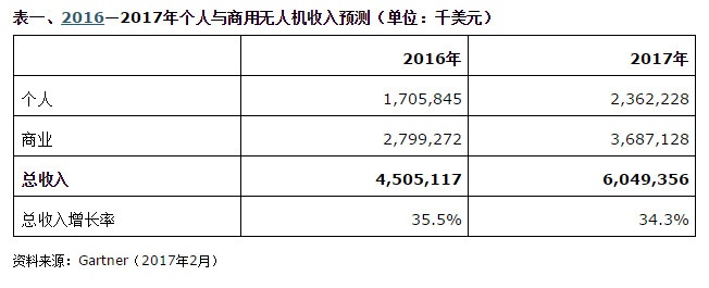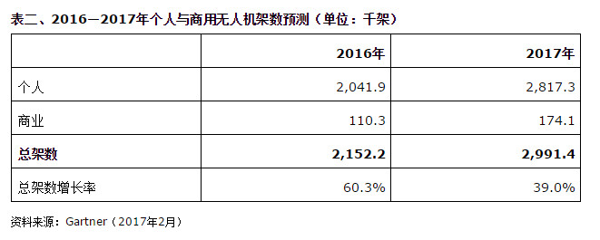 Gartner预测,个人与商用无人机的产量正在快速增长,无人机的全球市场收入预计将增加34%,在2017年将超过60亿美元,并在2020年超过112亿美元(参见表一)。2017年无人机的产量将接近300万架,比2016年增加39%(参见表二)。