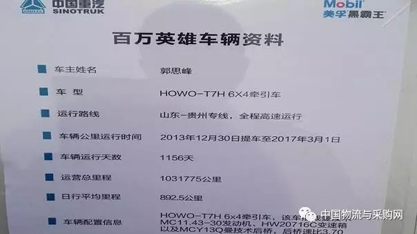 中国重汽车主郭思峰所驾驶的HOWO-T7H 6x4牵引车,该车搭载曼技术MC11.43-30发动机、HW20716C变速箱以及MCY13Q曼技术后桥,后桥速比3.70,车辆主要行驶山东-贵州专线,全程高速运行。这辆英雄车的行驶里程于2016年12月24日达到100万公里,成为2016年度内第二辆突破100万公里的中国重汽曼技术产品。