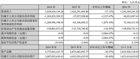 4月26日晚间,智能快递柜“速递易”母公司成都三泰控股集团股份有限公司发布2016年度财务报告,营业总收入为103945.41万元,同比下降27.12%;营业利润为-124237.52万元,同比下降1428.69%;利润总额为-128549.66万元,同比下降5427.77%;归属于上市公司股东的净利润为-130383.54万元,同比下降3337.67%,基本每股收益为-0.95元/股,同比下降3066.67%。