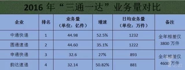 最具可比性的是业务量,因为这个是最实在和直接的体现。根据申通、圆通、中通和韵达的2016年年报,2016年业务量数据如下: