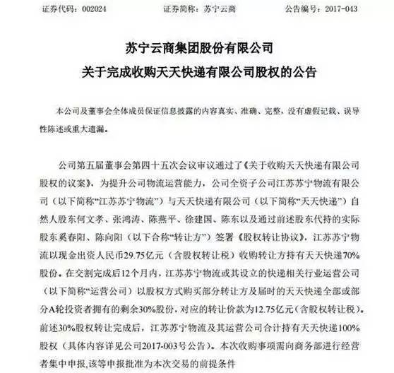 28日晚间,苏宁云商(002024)发布《关于完成收购天天快递有限公司股权的公告》,其中提到,2017年3月,此项收购已通过商务部反垄断审查。近日,双方已按照《股权转让协议》约定,完成天天快递70%股份的交割手续。