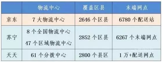 通过对比可见,目前苏宁仅在末端网点方面少于京东,在物流中心和区县覆盖率方面略胜一筹,“苏宁+天天”则大大超过竞争对手,具有打造国内零售最大的自营物流企业的基础。
