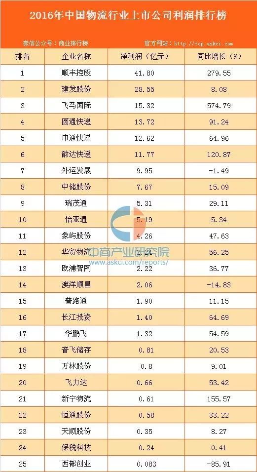 截至2017年4月28日,国内已有25家物流行业上市公司披露2016年年报。其中,顺丰控股实现净利41.8亿元,居于国内物流业榜首。位于第二第三的分别是建发股份和飞马国际,飞马国际成为了2016年物流业的一匹黑马,净利增速达到574.79!而圆通、申通、韵达净利位列第四、五、六位,盈利均超过10亿。