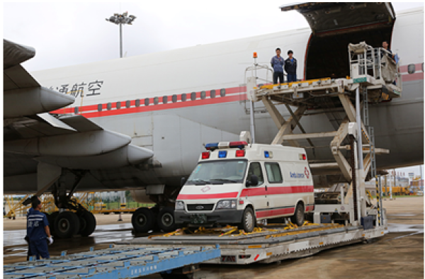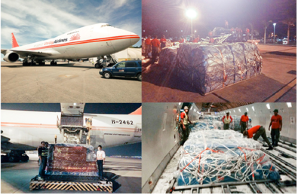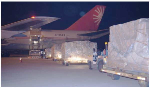 9月27日早6时,友和道通航空全货包机搭载着中国政府捐赠至尼泊尔的援助物资,沿“武汉—天津—加德满都”航线顺利起飞。23日至25日期间,援助物资分三批陆续到达天津机场。友和道通航空公司协助天津机场货运,实现了从交货、报关报检、库房操作、机坪装卸、航服航务的“一站式”服务,顺利完成此次包机5350件共计92298公斤货物的保障任务。友和道通航空救援物资的顺利运输,为尼泊尔救援行动保驾护航。