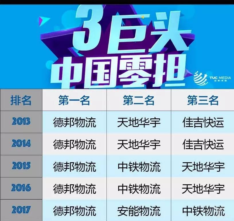 昔日零担三巨头,除了德邦依然稳居第一,天地华宇和佳吉快运分别跌至第六位和第十位,增长缓慢甚至负增长。