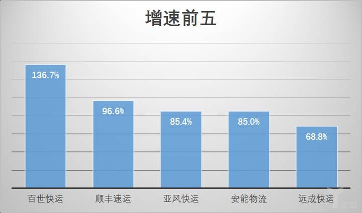 从零担30强2016年的营收增长速度分析,百世快运以136.7%的增速居第一,顺丰速运以96.6%的增速居第二,亚风快运以85.4%的增速居第三,安能以85%的增速居第四,远成快运以68.8%的增速居第五。