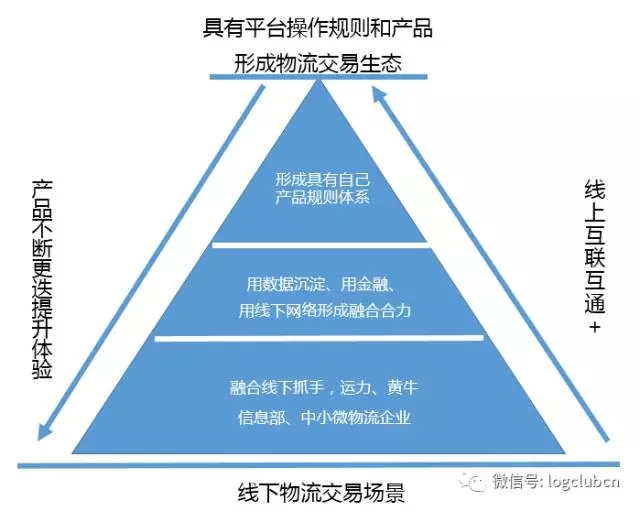 其实我们在观察过去三年里面的物流平台,我们会发现就是一个三角形,等边三角形,用两个指点加上产品形成等边,逐级进行整合的过程。