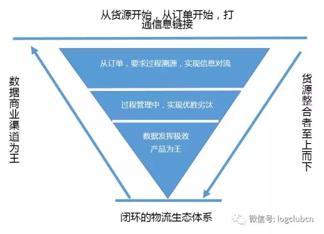 从货源端入手,从信息对接入口,从订单开始,要求信息链接,要求整个交易场景可视化,要求涉及的仓储必须可视,形成一个大平台的开放与协同,完全的打破了物流平台从下至上的过程,形成了强大的数据沉淀,发挥了数据的极致,打造了渠道为王,产品为王的生态王国。