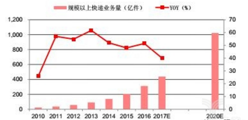 预计2017年我国快递业务量将达到438亿件,日均1.2亿单;2020年日单将在2.8亿左右,快递业务完成总量不低于1022亿单,2016-2020年的复合增长率高达34.44%。