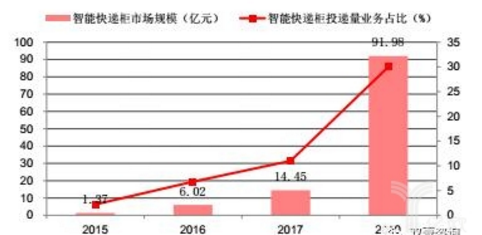 2016年11月份左右,智能快递柜行业内的企业基本上启动了全面收费模式。据统计目前快递柜每单收取0.2-0.6元的服务费不等,按照每单收取0.3元服务费进行测算,预计到2017年智能快递柜的市场规模为14.45亿元,2020年市场规模将达到91.98亿元,复合增长率高达85.31%。智能快递柜具有广阔的市场前景,加之如果智能快递柜能够成为打开社区的一个入口,连接更多的商业模式,那么其市场价值将会得到成倍增长。