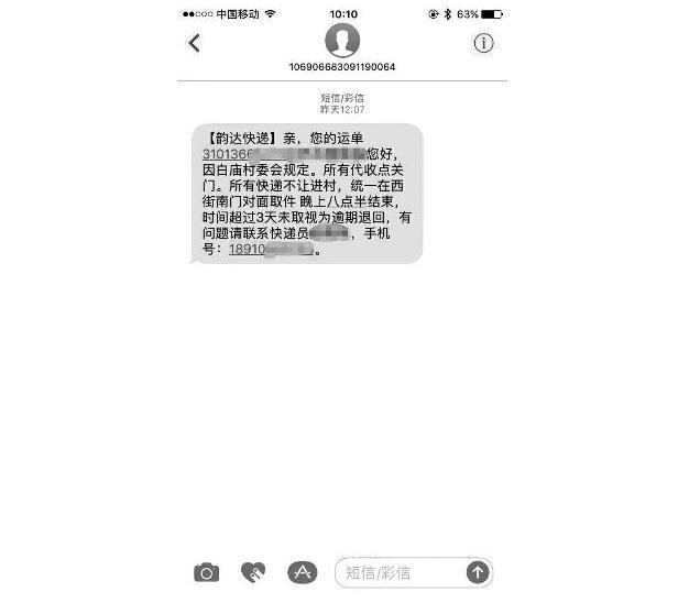 小金告诉记者,她平日经常网购,但因上班时间并不在家,快递到了小区大多要求快递员放到代收点,自己下班后顺路取走,很方便。记者从她提供的短信截图中看到快递公司发的信息:“因白庙村委会规定,所有代收点关门,所有快递不让进村,统一在西街南门对面取件,晚上八点半结束。”末尾附上快递员联系方式。因小金昨日并不在家,收到短信后她只能叫了一个跑腿,花10块钱让别人帮她取了快递。如今物流行业发达,网购更是稀松平常,但快递难进村让小金觉得十分不便。