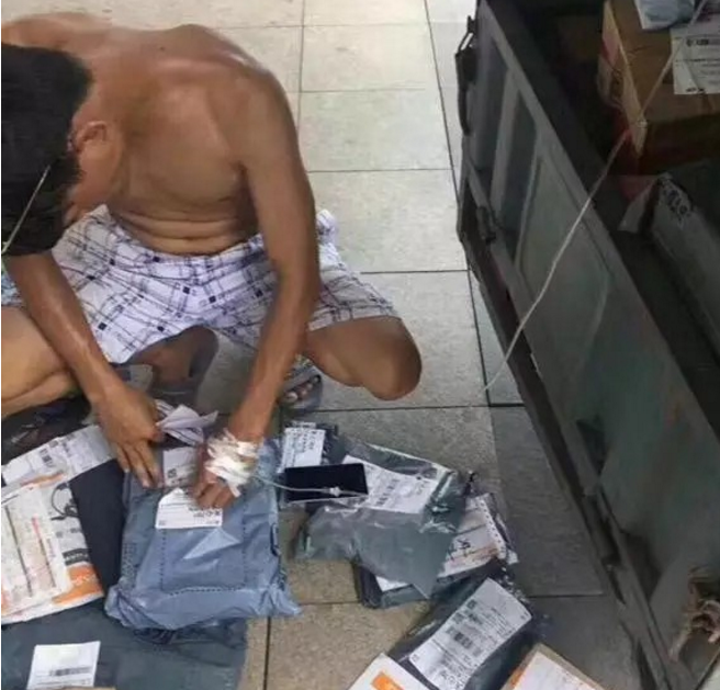◎7月25日,长沙一名快递员边输液边送货。据快递员自己说,他前两天就中暑了,扛到今天才去医院,但是又怕耽误送快递被投诉,只有边打点滴边送;