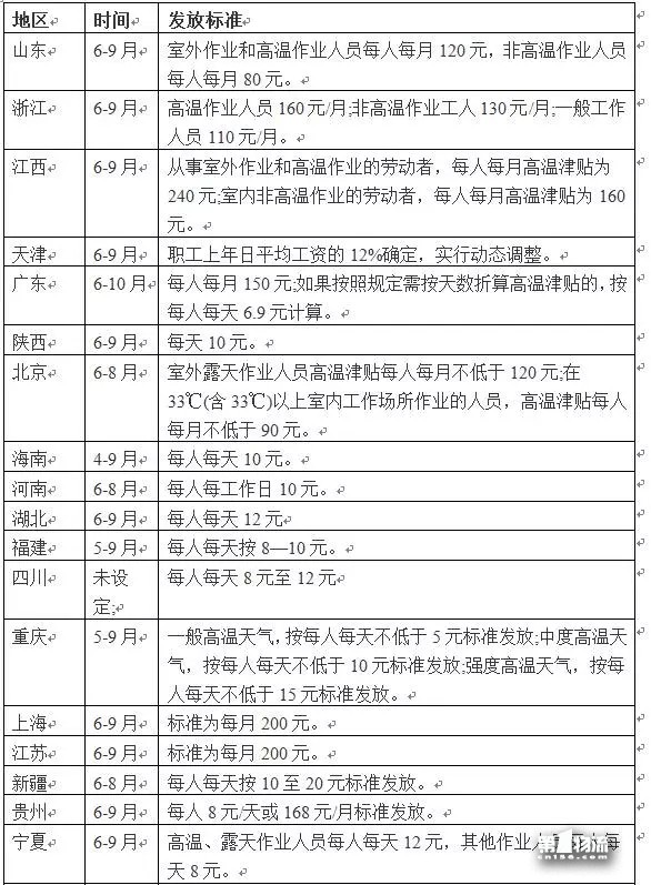 按照人社部的要求,各地根据自己的实际情况,出台了各自的高温补贴发放标准。
