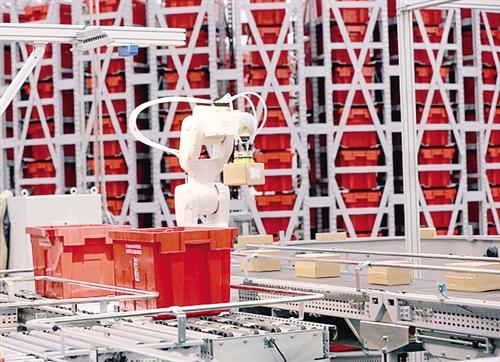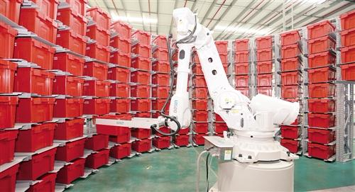 缓存机器人站在高高的红色货箱包围圈里挑选着货物